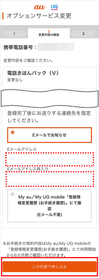 ※Eメールでのお知らせが不要の場合は、「My au/My UQ mobile「登録情報機種変更履歴(お手続き)」にて確認(Eメール不要)」をタップします。