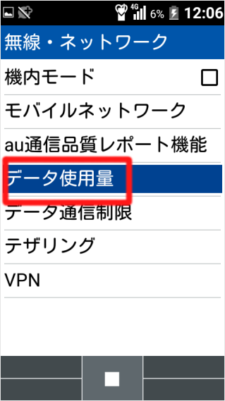 「データ使用量」を選択し、[センターキー]を押します。