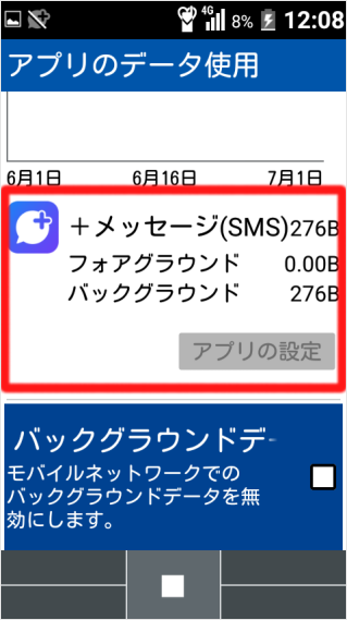 「アプリの使用状況」の一覧で、普段あまり利用していないにもかかわらずデータ量が多いアプリを選択します。 ※ここでは「+メッセージ(SMS)」を選択し、[センターキー]を押します。