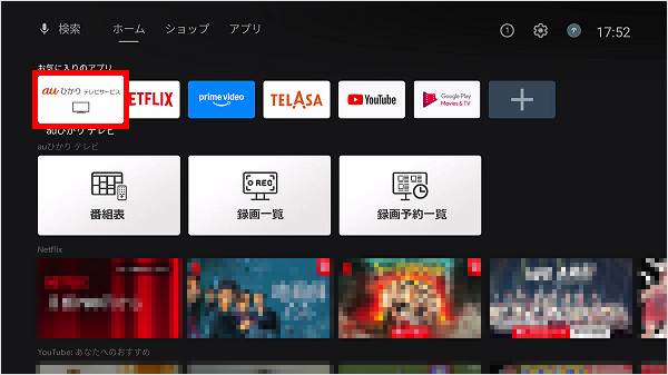 Android TV ホーム画面で[auひかり テレビサービスアプリ]を選択し、リモコンの「決定」ボタンを押します。