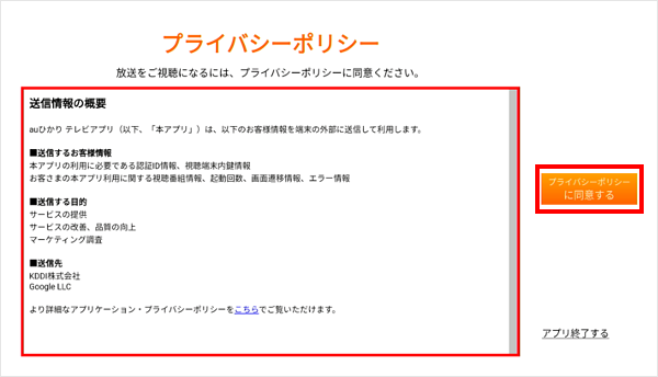 [プライバシーポリシーに同意する]を選択し、リモコンの「決定」ボタンを押します。
