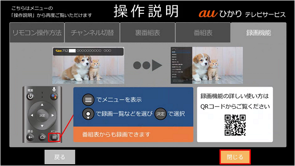 「録画機能」の説明まで確認したら、[閉じる]を選択し、リモコンの「決定」ボタンを押します。