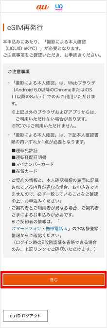 「eSIM再発行手続き」のページにアクセスしてau IDとパスワードを入力します。