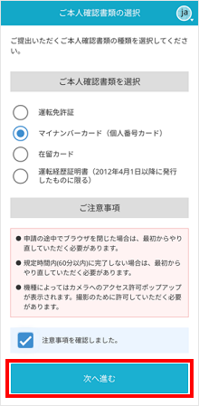 注意事項を確認の上[進む]をタップします。