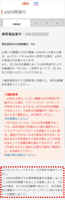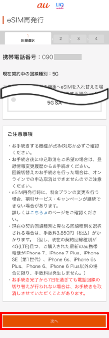 再発行後に利用する機種の回線種別を選択します。