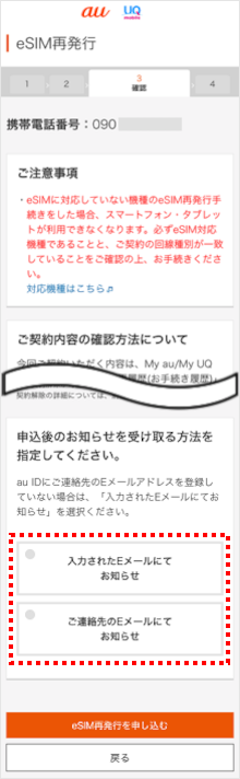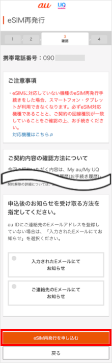eSIMを誤って削除したり、端末を故障・紛失した場合、My au/My UQ mobile(Web)でeSIMの再発行手続きを行い、再度お手元の端末でeSIMを利用することができます。