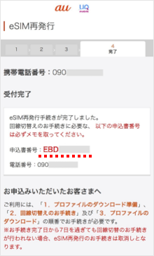 受付完了が表示されたらeSIM再発行手続きは完了です。