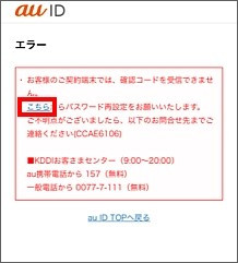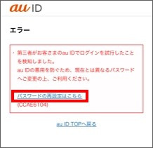 KDDIでは、au IDを悪用する詐欺などの被害を防ぐため、第三者がお客さまのau IDでログインを試そうとした可能性がある場合にエラーメッセージを表示し、お客さまご自身にパスワード変更をしていただく対策を行っています。