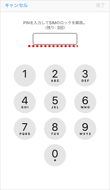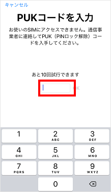 PINコード入力画面で、PINコードを3回連続で間違えると「PUKコード」入力画面に移ります。