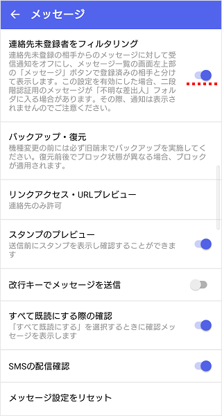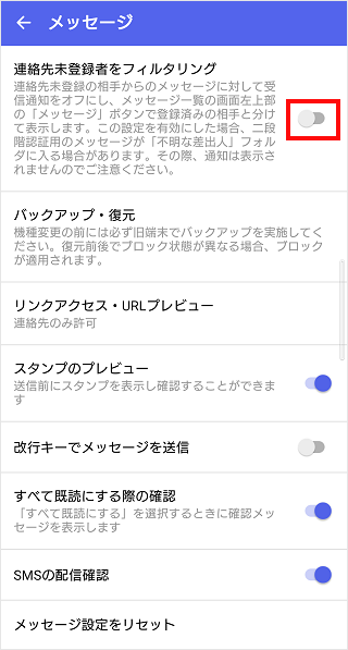 [連絡先未登録者をフィルタリング]のスイッチをタップしてオンにします。