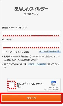 管理者ID(メールアドレス)とパスワードを入力し、「私はロボットではありません」にチェックをして、[ログイン]をタップします。