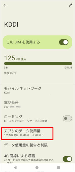 消費内容の詳細やバックグラウンドのデータ使用の変更などができます。