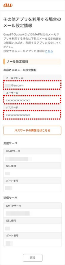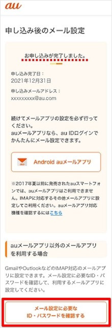 申込完了後、[メール設定に必要なID・パスワードを確認する]をタップします。 ※auメール持ち運びのマイページで確認する場合は、[メールアプリの設定]をタップ→[メール設定に必要なID・パスワードを確認する]をタップしてください。 auメール持ち運びのマイページはこちら