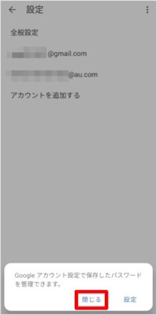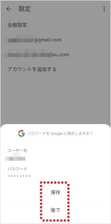パスワードをGoogleに保存するかポップアップが表示されます。 保存する場合は[保存]、しない場合は[後で]をタップします。
