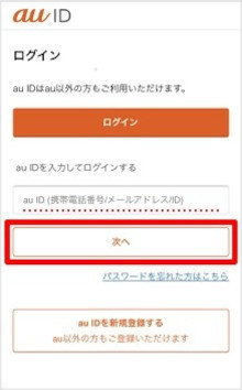 メールアドレスを利用していたau IDを入力し、[次へ]をタップします。 この画面が表示されない場合は手順5に進みます。 ※au IDログイン時にWi-Fi接続している場合、「2段階認証」の操作が必要になる場合があります。