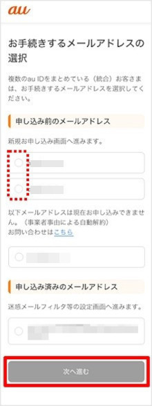 この画面が表示された場合は、「auメール持ち運び」を申し込むメールアドレスを選択し、[次へ進む]をタップします。 この画面が表示されない場合は手順7に進みます。