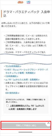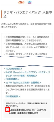 利用規約を確認したら「上記注意事項およびau PAY(auかんたん決済)会員規約に同意します」をタップし、チェックをつけます。