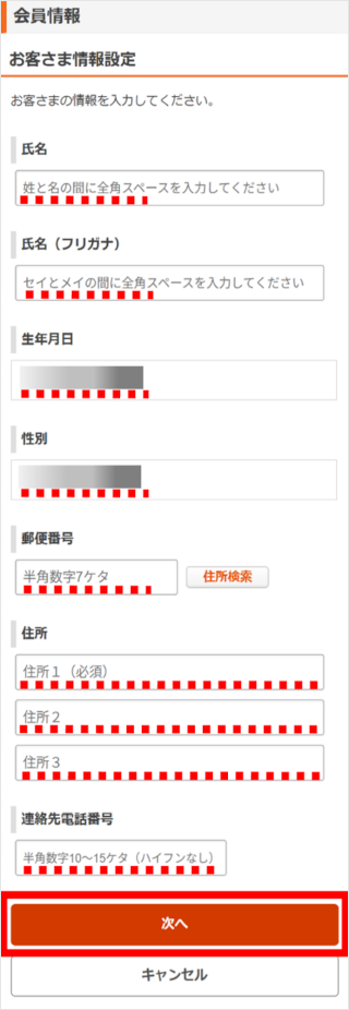 変更したい項目を入力し、[次へ]をタップします。 ※「郵便番号」を入力し、[住所検索]をタップすると「住所1」に検索結果が設定されます。