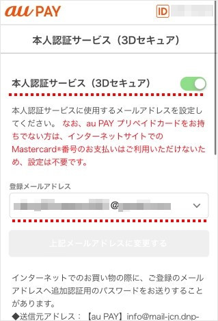 [本人認証サービス(3Dセキュア)]のスイッチをタップしてオンにします。