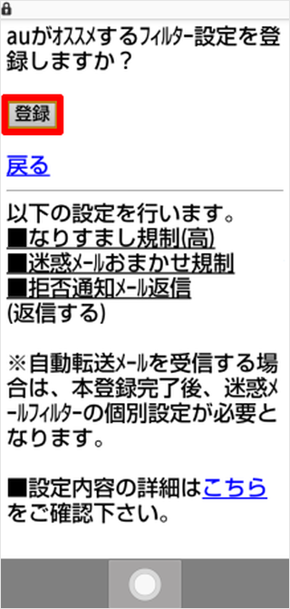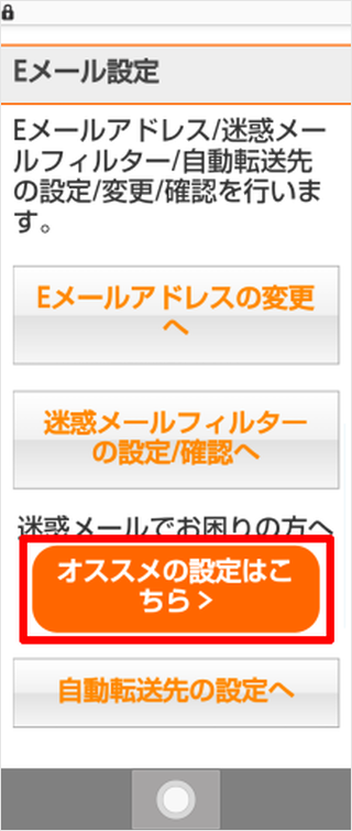 迷惑メールフィルターの設定画面で「オススメ設定」の登録ができます。