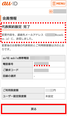 ※連絡先メールアドレスに「【au ID】代表契約変更完了のお知らせ」という件名のメールが送信されますので、ご確認ください。