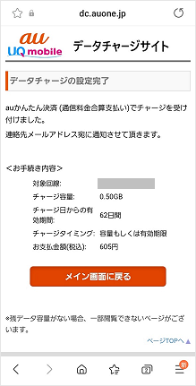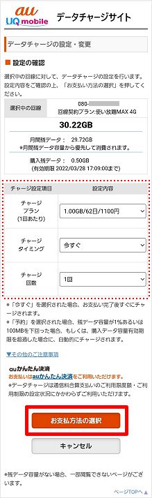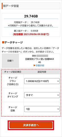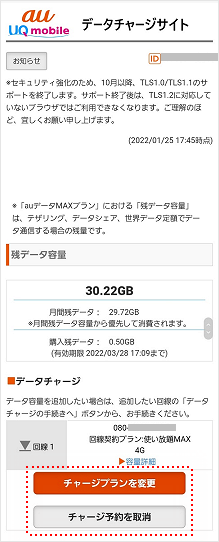 データチャージ予約状態の場合、データチャージサイトで変更または取り消しを行うことができます。 操作方法は以下をご確認ください。