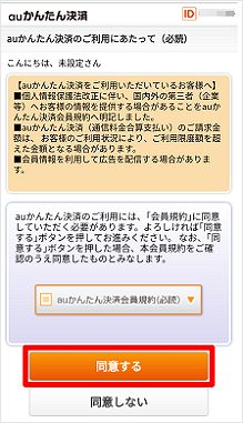 初めてau PAY (auかんたん決済)をつかう場合は、承諾画面が表示されるので[同意する]をタップします。 ※表示されない場合は手順4に進みます。
