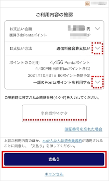 支払い方法やポイント利用の有無を変更したい場合は、[Vマーク]をタップします。 設定後、暗証番号を入力し[支払う]をタップします。