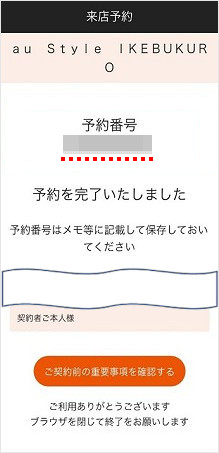 予約番号が表示されます。 以上で、来店予約の操作は完了です。 ※予約完了メールが届きます。