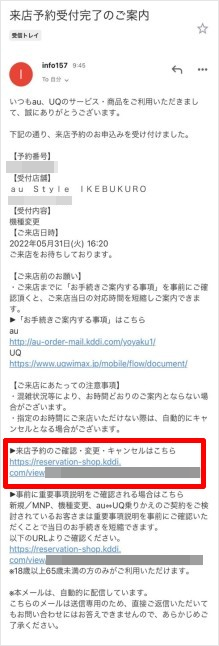 来店予約時に届いたメールに記載されている「来店予約のご確認・変更・キャンセルはこちら」の[URL]をタップします。