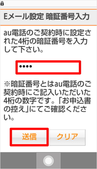 暗証番号を入力し、[送信]を押します。 ※暗証番号がご不明な場合は以下をご確認ください。 4桁の暗証番号を忘れた場合はこちら
