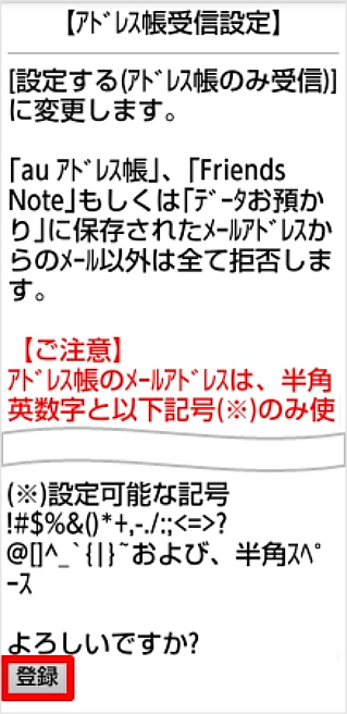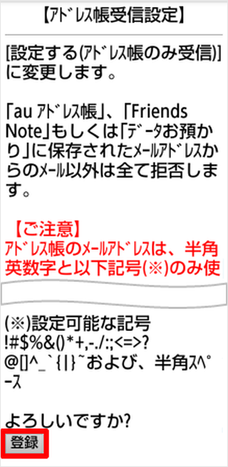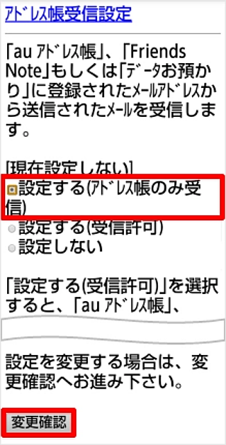 「設定する(アドレス帳のみ受信)」または「設定する(受信許可)」のうち、ご希望の項目にチェックを入れ、[変更確認]を押します。 ※本手順では、例として「設定する(アドレス帳のみ受信)」を選択しています。