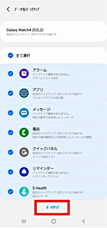 バックアップする項目を選択し、[バックアップ]をタップします。
