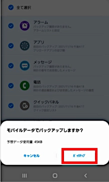 ※Wi-Fiに接続していない場合は、「モバイルデータでバックアップしますか?」と表示されるので、モバイルデータでバックアップされる場合は「はい」をタップします。