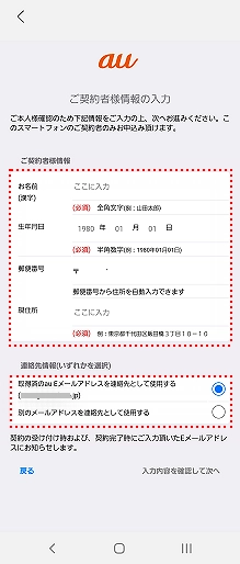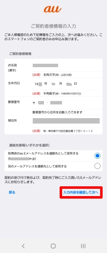 「ご契約者様情報」と「連絡先情報」を入力・選択し、[入力内容を確認して次へ]をタップします。