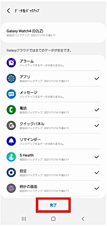 バックアップする項目を選択し、[バックアップ]をタップします。