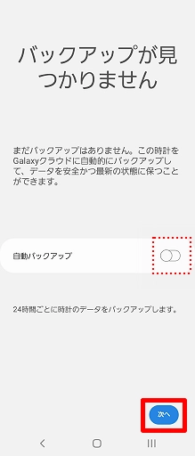 以下の画面が表示されますので、必要に応じて「自動バックアップ」をオンにし、[次へ]をタップします。