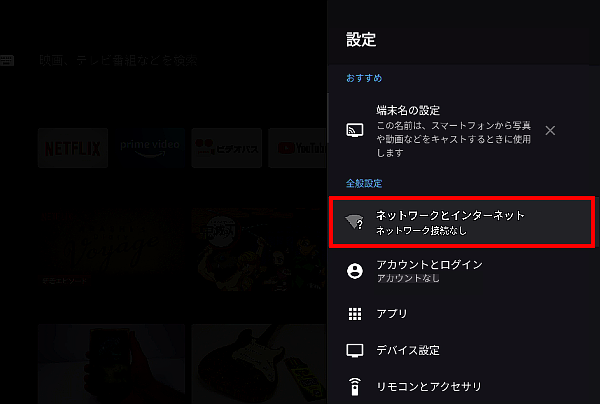 [ネットワークとインターネット]を選択し、リモコンの[決定]ボタンを押します。