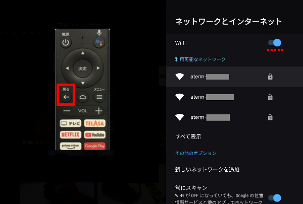 Wi-FiがONになったことを確認し、リモコンの[戻る]ボタンを押します。