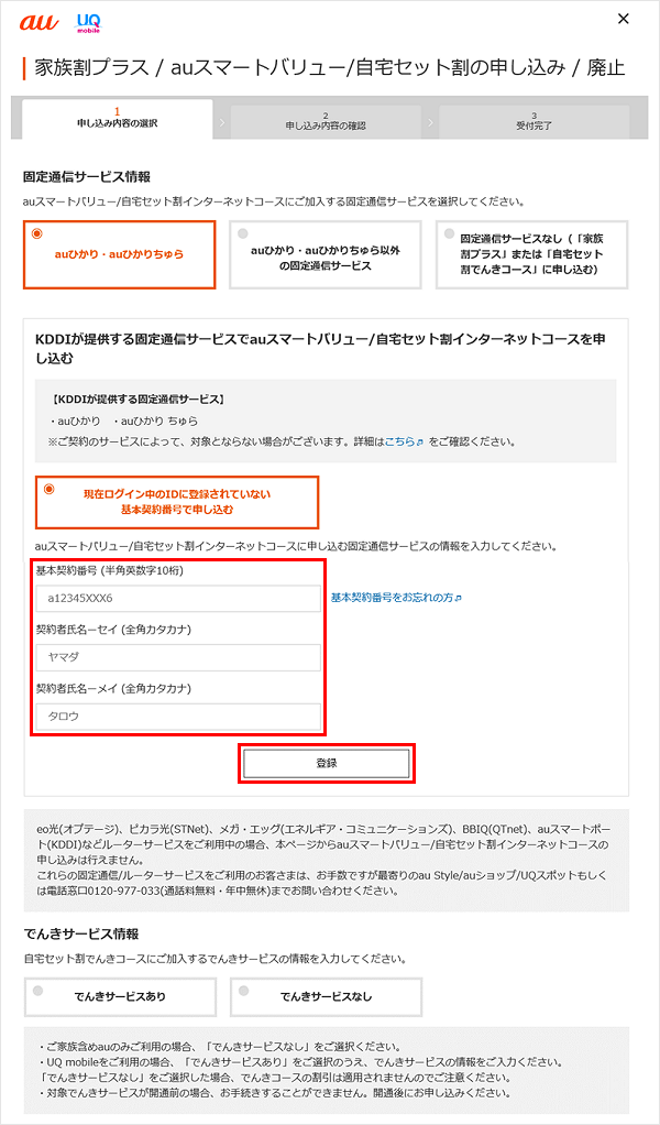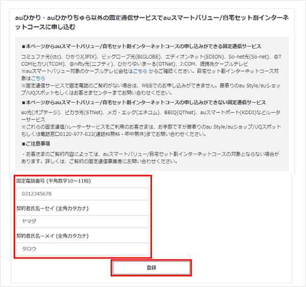 固定通信サービスの情報を入力し、[登録]をクリックします。