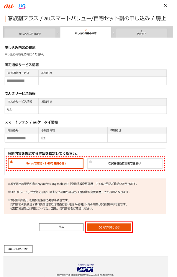 契約内容を確認する方法を選択し、[この内容で申し込む]をクリックします。