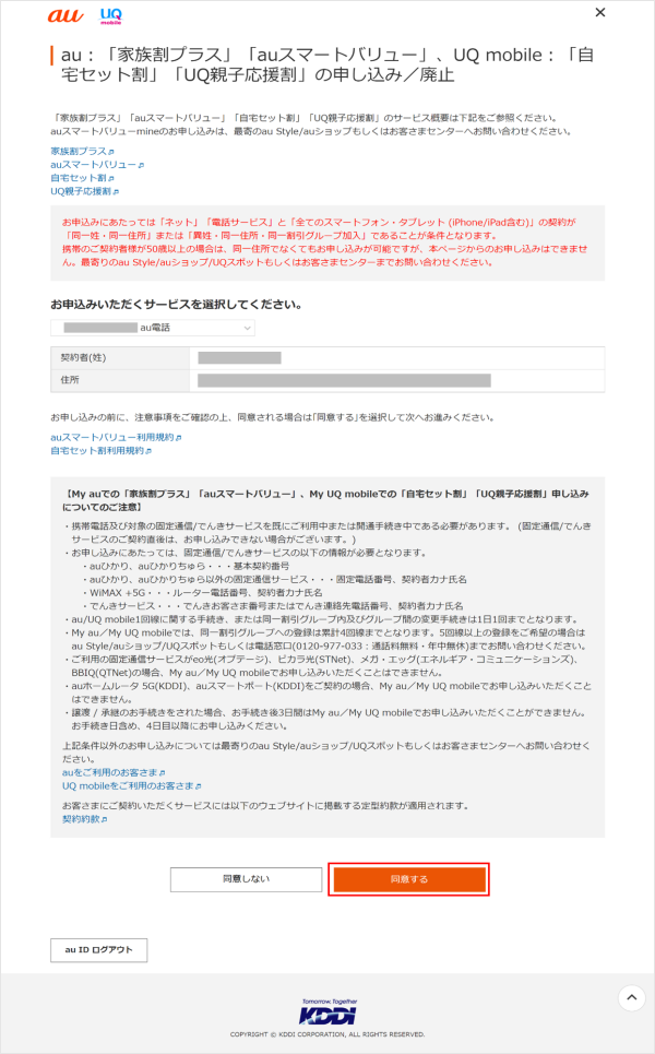 「My au(Web)」で対象となるau携帯電話の料金プランやデータ定額サービスをご利用中であることをご確認ください。