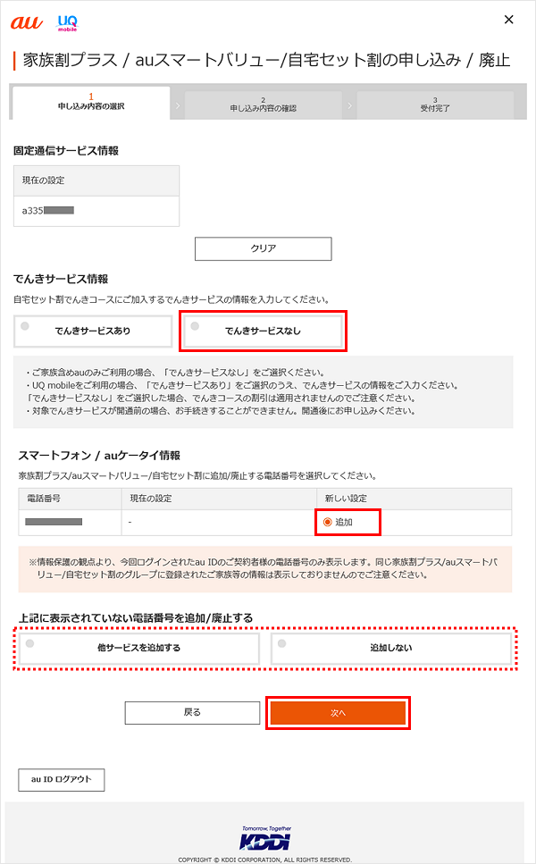 「でんきサービス情報」の[でんきサービスなし]、「スマートフォン / auケータイ情報」の[追加]を順にクリックします。 「他サービスを追加する」/「追加しない」を選択し、最後に[次へ]をクリックします。