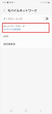 [5G/4G/3G(自動接続)]/[4G/3G(自動接続)]のどちらかを選択します。 ※海外で通話やデータ通信の品質が悪い場合は、「ネットワークモード」を「3G」に切り替えると改善されることがあります。