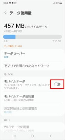 [モバイルデータ]のスイッチをタップしてオフにします。