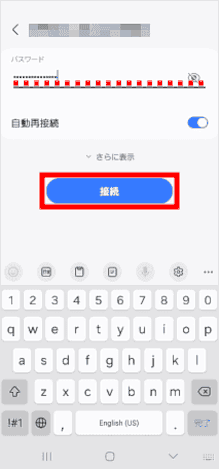 パスワード(暗号化キー)を入力し[接続]をタップします。 ※フリーWi-Fiに接続する場合、表示されないことがございます。