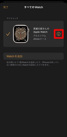 ナンバーシェアを解除するApple Watchの右端の[i]をタップします。