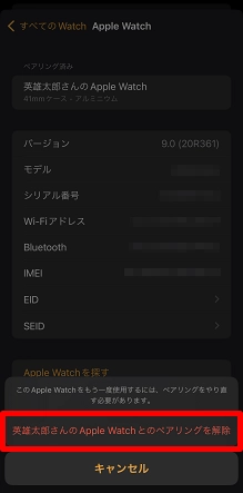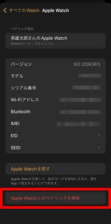 [○○のApple Watchとのペアリングを解除]をタップします。