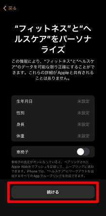フィットネスとヘルスケアの設定画面が表示されます。