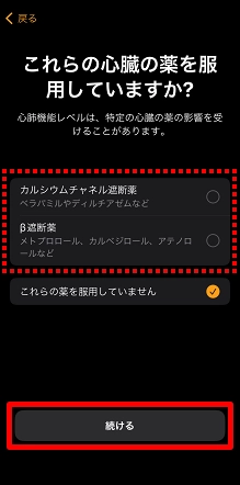 内容を確認の上、該当する薬を服用している場合は選択し、[続ける]をタップします。